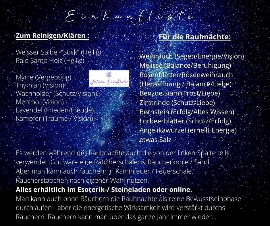 (Start bereits zur Sonnwende am 21.12. und damit du dir evt. noch Dinge von der EINKAUFSLISTE (siehe unterm Sonnwend-Video) zum Räuchern besorgen kannst)